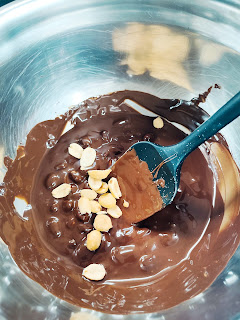 2. Por otro lado, ponemos a derretir el chocolate con el aceite. Cuando ya esté derretido, añadimos los cacahuetes.